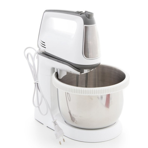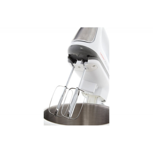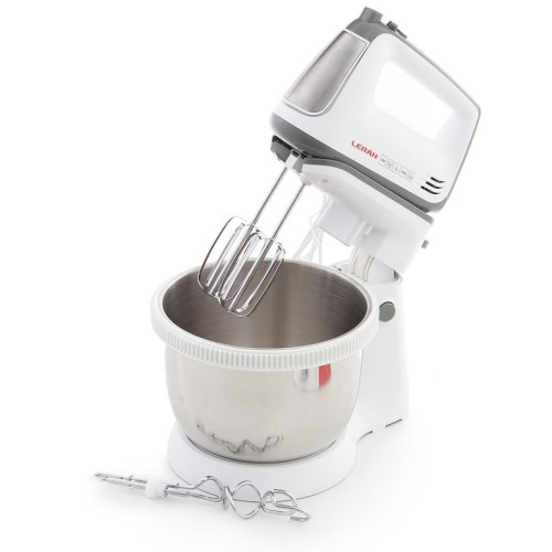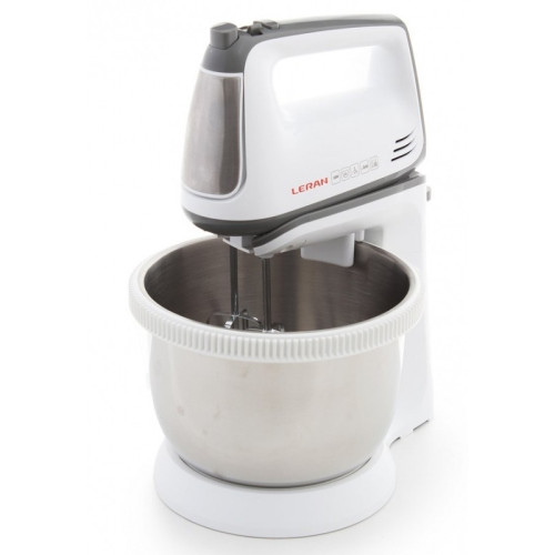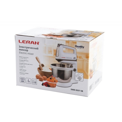 Многофункциональный миксер с чашей LERAN SMB 0557 SB LERAN SMB 0557 SB – электрический миксер с чашей объемом 3,4 л. Модель оснащена 500-ваттным мотором. Корпус миксера выполнен из белого пластика. Материал изготовления чаши – нержавеющая сталь. На верхней панели LERAN SMB 0557 SB находятся регулятор скорости и кнопка выпуска. На фронтальной стороне устройства находится декоративная вставка. На тыльной стороне миксера расположена кнопка выпуска. В комплекте с миксером поставляются насадки-венчики для взбивания и насадки-крюки для теста. Преимущества Для кратковременного увеличения скорости работы используется функция «Турборежим». Модель имеет 5 скоростных режимов. Отсоединение насадок осуществляется путем нажатия на специальную кнопку. Модель оборудована приспособлением для хранения насадок. Для быстрой чистки насадок достаточно их опустить в чашу с водой и включить устройство на несколько секунд. Миксер LERAN SMB 0557 SB отличается от моделей LERAN HM-501 и LERAN HM-0554 наличием чаши для взбивания и приспособления для хранения насадок. Назначение Миксер LERAN SMB 0557 SB предназначен для взбивания и смешивания различных продуктов в бытовых условиях. Данная модель не предназначена для коммерческого применения и использования на улице.