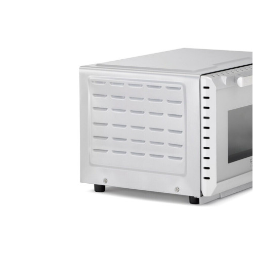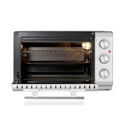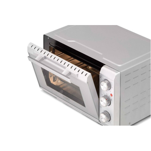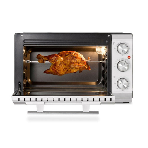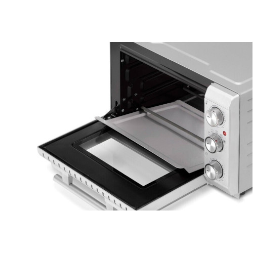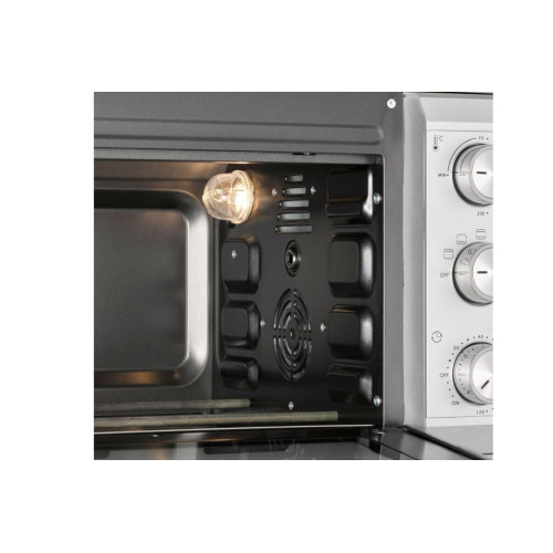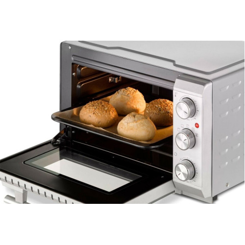 * Равномерная температура и быстрый нагрев благодаря 4-м нагревательным элементам из нержавеющей стали * Плавная регулировка температуры от 70 до 230 °C * Таймер до 120 минут с сигналом * Легкая очистка благодаря антипригарному покрытию камеры * Подсветка камеры * Дверца духовки с двойным стеклом * 3 уровня установки противня * Форма для выпечки диаметром до 27 см * Съемный поддон для крошек из нержавеющей стали * В комплект входят решетка для гриля, вертел, противень с антипригарным покрытием, приспособления для извлечения решетки для гриля и вращающегося вертела
