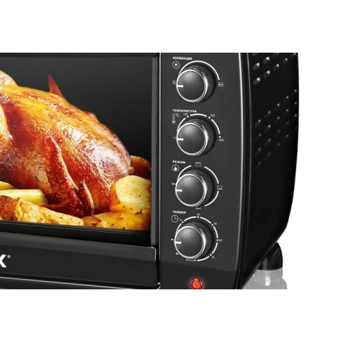 Электропечь Centek CT-1532 обладает внутренним объемом в 46 л, что позволяет готовить в ней одно большое блюдо, либо 2 пирога на противнях. При этом корпус электропечи отличается компактными размерами и подходит для установки на самой маленькой кухне. Электропечь имеет 3 режима работы в температурном диапазоне от 100 до 320°. Мощность духовки составляет 2000 ватт. Черный привлекательный корпус электропечи выполнен из металла. Опция автовыключения позаботится о безопасности, если вы забудете вовремя отключить духовку. Индикаторы работы и готовности сообщат владельцу о происходящем внутри электропечи. Эмалированное покрытие, которым оснащена печь Centek CT-1532, легко очищается вручную. Жаропрочное стекло модели сочетается с усиленными внутренними направляющими и хромированными переключателями. Длина сетевого шнура модели составляет 0.9 м. Также необходимо отметить, что в комплектацию электропечи входят противень и крюк для его вынимания.