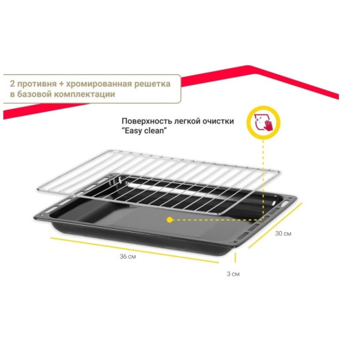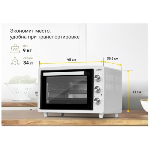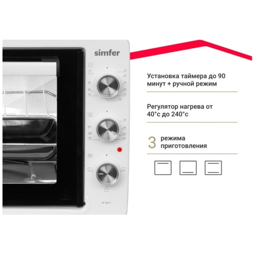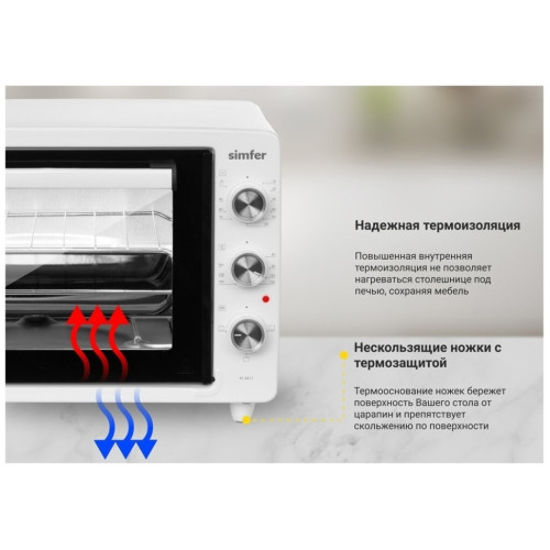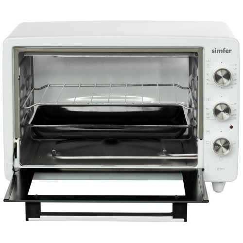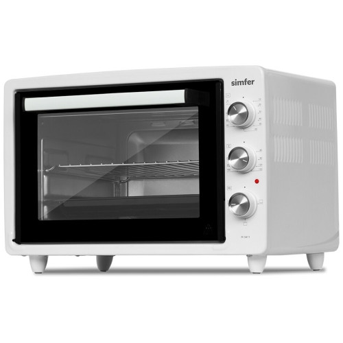 Настольная электродуховка M3416 M3411 от компании из Турции Simfer выпускается в серии ALBENI. Она представляет собой универсальный ростер, позволяющий готовить различные блюда и имеющий компактные размеры. Важной особенностью всей техники турецкого предприятия-производителя выступает бюджетная стоимость. Она достигается отлаженной технологией изготовления и продуманной конструкцией настольной электропечи. Главными конструктивными особенностями бытового устройства заслуженно считаются такие как: Стильный дизайн корпуса преимущественно черного цвета. Позволяет эстетично вписать мини-печь в интерьер помещения. Изготовление внутренних поверхностей их хромированного металла. Обеспечивает длительный срок службы и практичность в уходе. Небольшой вес и маленькие габариты изделия. За счет этого достигается мобильность электропечь и возможность установки в любом месте кухни. Вместительная камера для приготовления. Результатом становится возможность готовки блюд на всю семью. Экономичность в эксплуатации. Достигается за счет минимально возможного расхода электроэнергии. Удобство при использовании. Обеспечивается простой и понятной панелью управления с тремя регуляторами – температуры, длительности и режима работы. Бонусами становятся две опции – таймер на полтора часа и автоотключение при перегреве. Важными дополнительными достоинствами настольной духовки становятся такие: стеклянная дверца, позволяющая контролировать степень готовности блюда; дверная ручка с надежной защитой от нагрева; теплоизоляция ножек и корпуса, которая сводит к минимуму потери тепла.