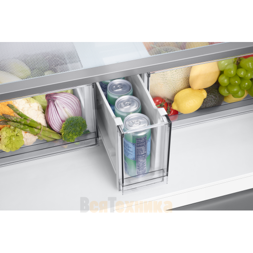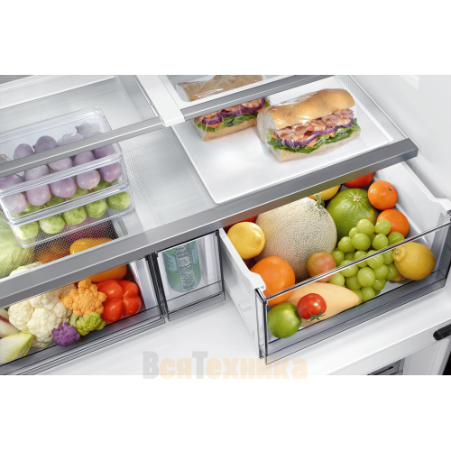 - Зона свежести с оптимальной влажностью: Специальный отсек позволяет регулировать уровень влажности, создавая идеальные условия для хранения овощей, фруктов и зелени, которые остаются хрустящими и сочными в несколько раз дольше.