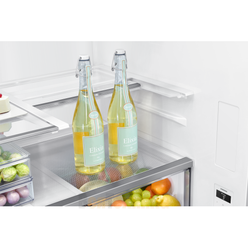 - Просторная холодильная камера: Многоуровневые полки из закаленного стекла выдерживают большой вес, а система FlexZone позволяет гибко настраивать пространство под ваши нужды.