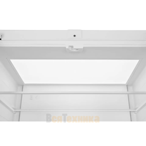 - Широкая холодильная камера: Просторные полки, включая прочные стеклянные, и удобные дверные полки позволяют рационально разместить продукты всех размеров.