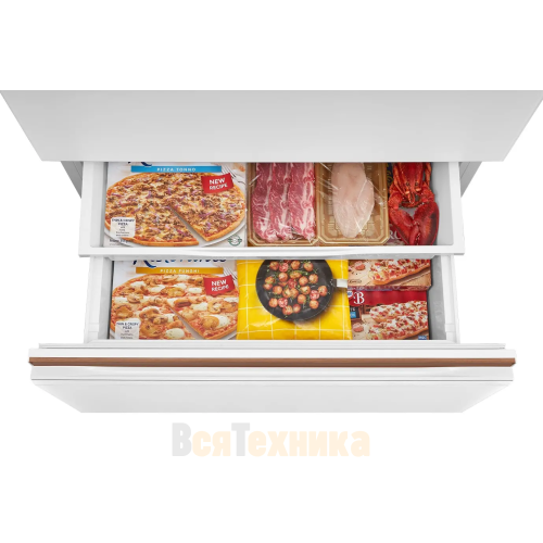 - Вместительная морозильная камера: Глубокие выдвижные ящики и полки помогают систематизировать заморозку, отделяя мясо от овощей, полуфабрикаты от ягод.