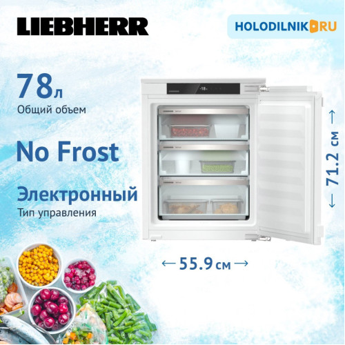 Встраиваемый морозильник Liebherr IFNe 3503-20 001 NoFrost Встраиваемая морозильная камера с функцией NoFrost Особенности: NoFrost Открывая морозильное отделение, вы хотите видеть замороженные продукты, а никак не лёд или иней. NoFrost защищает морозильную камеру от нежелательного обледенения, расходующего много энергии и порой стоящего достаточно дорого. NoFrost означает: никакого больше утомительного и продолжительного размораживания морозильного отделения, больше времени для других дел – и экономия денег. Сенсорный экран Реальность прикосновения: сенсорный экран позволяет легко и интуитивно управлять вашим устройством Liebherr. Все функции наглядно расположены на экране. Легким касанием пальца вы можете легко выбрать функции или проверить текущую температуру холодильника. Супер тихий / SuperSilent Тссссс — слушайте внимательно: ваш Liebherr настолько тихий, что вам придётся навострить уши, чтобы его услышать. Что за этим стоит? Все холодильные компоненты, такие как компрессоры, клапаны, вентиляторы и испарители, оптимизированы и идеально согласованы друг с другом. Чтобы на вашей кухне вы слышали только то, что хотите. Настройка языка Отныне вы всегда будете понимать ваш Liebherr наилучшим образом: потому что он говорит на вашем языке. Это стало возможным благодаря настройке различных языков. Просто при включении устройства выберите на экране один из двенадцати языков – и управляйте вашим Liebherr на желаемом языке. EnergySaver Хотите одновременно сэкономить энергию и деньги? Ваш Liebherr поддержит вас в этом – с помощью энергосберегающего режима. Когда вы активируете EnergySaver, стандартная температура увеличивается на два градуса. Так вашему Liebherr требуется ещё меньше электроэнергии – а ваши продукты остаются оптимально свежими. SuperFrost Хотите заморозить свежие продукты с бережным сохранением витаминов? Просто активируйте SuperFrost – и морозильное отделение увеличит холодопроизводительность. Так температура останется постоянной, когда вы закладываете незамороженные продукты. SuperFrost одновременно экономит энергию: если вы не отключите функцию вручную, она отключится автоматически через 65 часов. Блокировка экрана Светящийся экран – это магнит для детских рук, и ваш Liebherr знает это. Вот для чего существует блокировка экрана: она надёжно предотвращает непреднамеренное изменение настроек вашего холодильника. Конечно, вы также можете просто отключить блокировку экрана. PartyMode Теперь и гости могут прийти – ведь и ваш Liebherr тоже в праздничном настроении: В режиме PartyMode активируются функции SuperCool и SuperFrost. Через 24 часа Liebherr автоматически вернется в нормальный режим. Сигнал об отключении питания Ваш Liebherr - настоящий ангел-хранитель продуктов: в случае отключения питания он надёжно подаёт сигнал тревоги. Его вы сможете не только слышать, но и видеть. На экране отображается максимально достигнутая температура в морозильном отделении. Но вас никогда не побеспокоят без надобности: если при кратковременном отключении питания температура повышается не критически, сигнал тревоги остаётся выключенным. Аварийный сигнал открытой двери Аварийный сигнал открытой двери в вашем Liebherr следит за тем, чтобы вы не тратили лишнюю энергию и не испортили продукты: как только дверь холодильника остаётся открытой слишком долго, он предупредит вас – мигающим светом и предупреждающим звуковым сигна