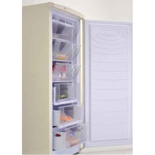 Морозильная камера высотой 144 см. • общий объем 210 л • высота / ширина / глубина: 144х57х62 см • класс энергопотребления A+ • ламинированная внутренняя поверхность холодильника с антибактериальным покрытием • цельные пластиковые ящики с прозрачной шторкой в морозильной камере • регулировка температуры с внутренней панели управления