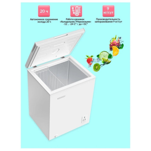 тип морозильника: ларь, размораживание: ручное, общий объем: 185 л, высота: 83.50 см, ширина: 63.50 см, глубина: 55.60 см, класс энергопотребления: A+, климатический класс: N, SN, ST, T, N-T +16°C / +43°C, количество ящиков/полок: 1, цвет корпуса: белый, минимальная температура в морозильной камере: -24, количество камер: 1, тип управления: электромеханическое, мощность замораживания: 6.50 кг/сут, уровень шума: 41 дБ