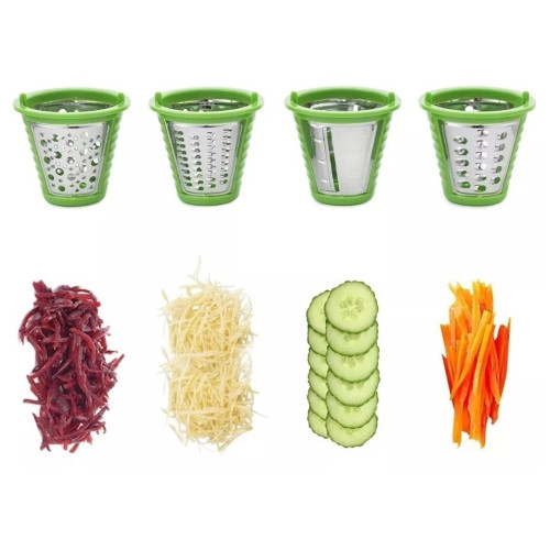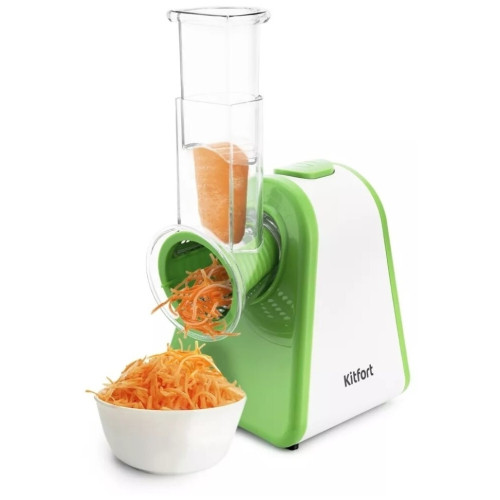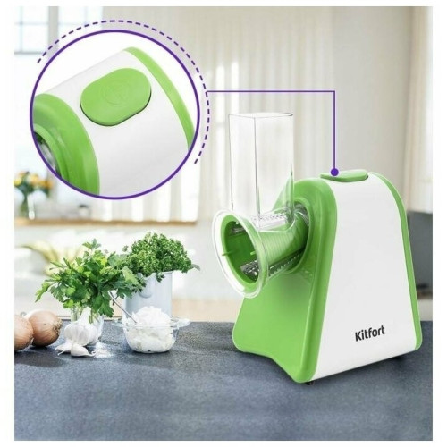 Тип: Измельчитель; Цвет корпуса: белый, зелёный; Материал корпуса: пластик; Мощность: 200; Измельчитель: да; Количество насадок в комплекте: 4; Материал погружной части: нет; Материал лезвия: нержавеющая сталь; Съёмный нож: да; Количество скоростей: 1; Мерный стакан: нет; Тёрка/шинковка: да; Отсек для хранения насадок: нет; Питание: от сети 220 В; Прочие свойства и особенности: Электрическая тёрка Kitfort КТ-1385 предназначена для тёрки и шинковки овощей, фруктов и других продуктов. Все продукты измельчаются автоматически, при этом контакт ножей тёрки с вашими руками исключён благодаря удобному толкателю Особенности: Отверстие для ингредиентов; Размеры: 15x21.1x29 см; Вес: 1,6