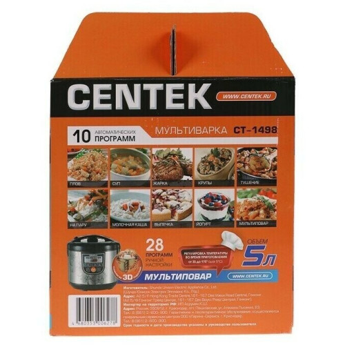 Мультиварка Centek CT-1498 наделена самыми необходимыми функциями и непременно займет достойное место на вашей кухне. Модель имеет 38 программ приготовления, из которых 10 автоматических. Так же предусмотрены функции поддержания и температуры и отсрочка старта.