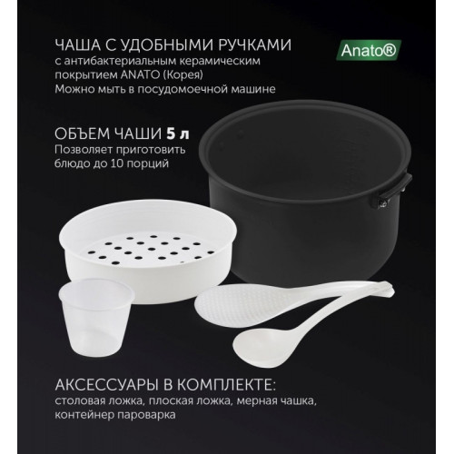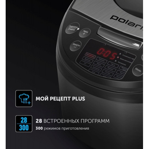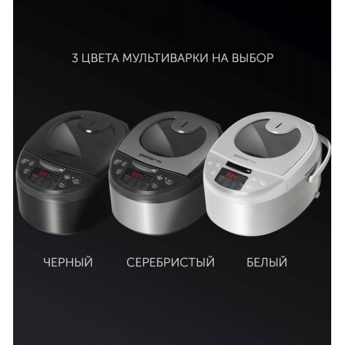 Мультиварка Polaris PMC 5016ADG серебристый/черный Мультиварка Polaris PMC 5016ADG – это компактная ифункциональная модель в линейке мультиварок POLARIS. В ней предусмотрено14 автоматических программ, позволяющих приготовить первые блюда,молочные каши, выпечку и даже варенье. Внутренняя чаша с керамическимпокрытием Anato с удобными ручками и объемом 5 литров предусмотрена дляприготовления до 10 порций одного блюда. Мультиварка Polaris PMC 5016ADG имеет большое стеклянное окно вкрышке. Таким образом, вы можете отслеживать процесс приготовленияблюда, не открывая ее. Модель оснащена таймером отсрочки 24 часа, чтопозволяет приготовить еду к назначенному времени. С мультиваркой идетстандартный набор аксессуаров: плоская ложка, столовая ложка, мернаячашка, контейнер для варки на пару. Режимы работы: Мой рецепт PLUS, Выпечка, Суп, Тушение, Жарка,Запекание, Плов, Паста, Варенье, На пару, Бобы, Молочная каша, Крупа,Разогрев.