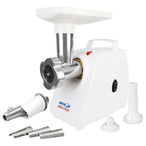 * мясорубка * мощность 230 Вт * перерабатывает 1.6 кг/мин * насадка для приготовления колбас * насадка для кеббе * корпус из пластика * шнековая соковыжималка * отсек для хранения насадок