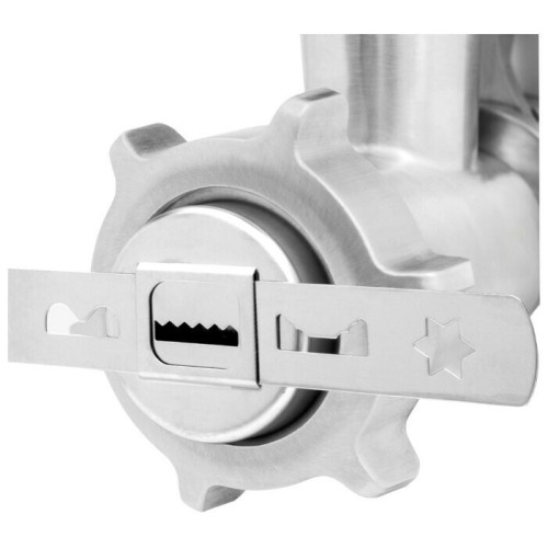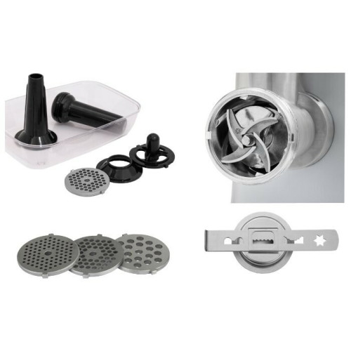 Электрическая мясорубка FW 2000 от немецкой компании Caso, которая оснащена двигателем с низким уровнем шума и функцией реверса. Благодаря большой мощности она легко справляется с любым мясом. Насадки, входящие в комплект, порадуют разнообразием возможностей самых требовательных поваров. Это диски из нержавеющей стали с отверстиями различного диаметра для приготовления всех видов фарша, насадки для колбас и для печенья. Хранить мясорубку можно как в коробке, так и в собранном виде. Все мелкие детали и аксессуары размещаются в загрузочной чаше с крышкой. Отметим большое удобство при хранении в загрузочной чаше всех аксессуаров, включая толкатель. А внешний вид мясорубки пробудит приятные чувства. Эстетически радующие округлые линии, благородная металлическая оправа. Тем, кто относится к процессу приготовления пищи не только как к обязанности, но и как к творчеству, будет приятно пользоваться таким устройством. Моторный блок выполнен из алюминиевого сплава. Блок довольно тяжел, что объяснимо скрытыми в нем 2000 Вт и назначением. Вес блока — 5,1 кг, он оснащен резиновыми ножками, которые позволяют добиться стойкого сцепления с поверхностью стола. С нижней стороны корпуса мотора имеется место для хранения шнура в свернутом виде. Прибор довольно легко удерживать в руках и переносить благодаря удобной форме корпуса.