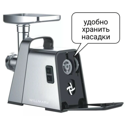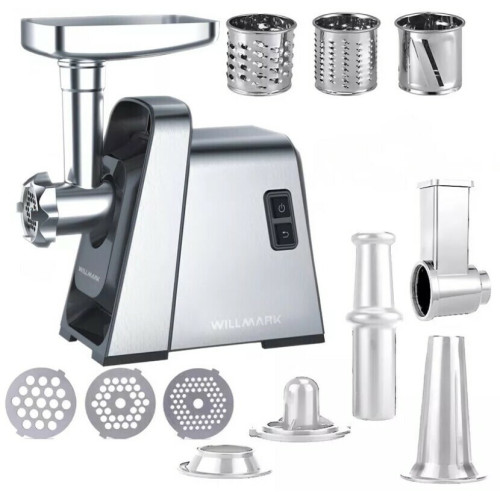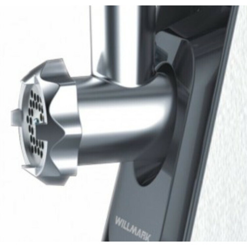 Электрическая мясорубка WILLMARK WMG-2140S обладает лаконичным дизайном и удобством в работе. В комплект входит руководство по эксплуатации, три решётки для мясорубки: с пропускными отверстиями 3мм, 5мм, 7 мм , пластиковый толкатель, насадки для сосисок и насадка «КЕББЕ», набор терок и шинковка. С помощью насадки-овощерезки Вы легко натрете и нашинкуете нужные вам продукты. Сверху расположен широкий металлический загрузочный поддон. На корпусе расположен переключатель работы мясорубки. Положение «ON» для начала перемалывания продуктов. Кнопка «REV» для очистки рабочей камеры и вращения шнека в обратную сторону – РЕВЕРС. Рабочая часть устанавливается на мясорубку под наклоном и поворачивается до вертикального положения, а снимается путем нажатия на кнопку расположенную на передней части корпуса и поворотом её вправо. Мотор способствует максимальной производительности, до 3,2 кг продукта в минуту. Максимальная мощность при блокировке вала достигает 2200Вт.