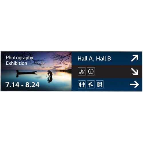 88BH7D создан для демонстрации мультиконтента с видео и текстом в соотношении которое пожелает пользователь. Дисплей оптимально показывать вертикальные или горизонтальные объекты без усечения, предоставляя зрителям реальные впечатления от просмотра. Это лучший способ привлечь внимание людей и максимально повысить рекламный эффект. Широкоэкранный формат дисплея 32:9 позволяет разместить максимум информации сохраняя компактные размеры. Разрешение Ultra HD обеспечивает впечатляющий просмотр с яркими цветами и четкими изображениями. Функция PBP (картинка рядом с картинкой) позволяет вывести 2, 3 или 4 независимых изображения и использовать размер экрана максимально эффективно. С помощью мультимедийного редактора LG SuperSign вы можете легко редактировать изображения или видеоклипы до соотношения 32:9. Для того, чтобы наиболее эффективно редактировать различные материалы существует 6 портретных и 6 ландшафтных шаблонов.