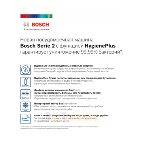 Выбирая Bosch SPV2IMY2ER, вы инвестируете в долговечность, экономию и безупречный уход за посудой.