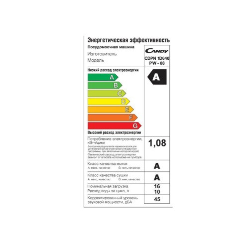 | Энергопотребление за цикл, кВт/ч | 1.08 |