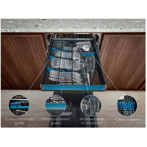 Особенности конструкции внутренняя поверхность из нержавеющей стали, использование средств 3 в 1, открывание без ручки, регулируемая по высоте корзина для посуды, сенсор чистоты воды