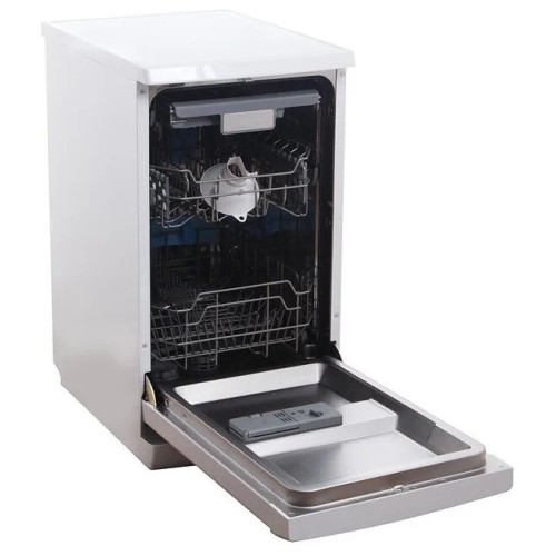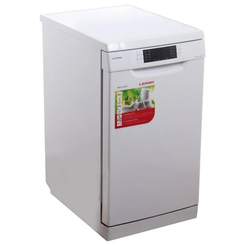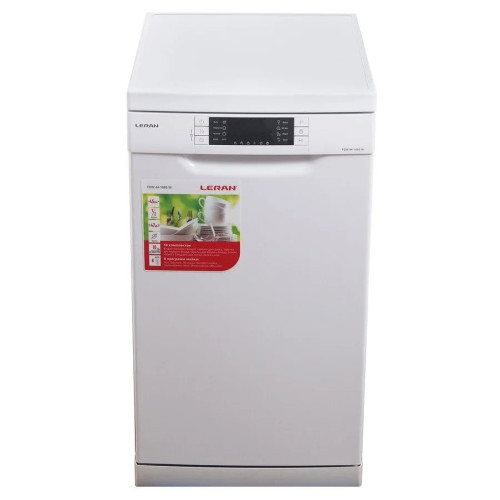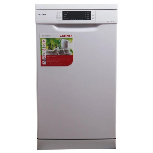 "Посудомоечная машина LERAN FDW 44-1085 W — это узкая посудомоечная машина на 10 комплектов посуды с электронным управлением и современной компоновкой. Хорошо отмывает даже сложные загрязнения и может быть установлена как отдельно, так и под столешницу. Дополнительная корзина для столовых приборов с дополнительным распылителем освобождает пространство на двух ярусах для крупной и мелкой посуды. Средняя корзина настраивается по высоте чтобы пространство внутри машины использовалось эффективнее. На дверце расположен информативный дисплей, который поможет выбрать любой из 8 режимов мойки и подскажет время до окончания программы. Есть интенсивная и экономичная программы, программа для бережного мытья хрупкой посуды и функция предварительного полоскания. Есть возможность половинной загрузки, дополнительная сушка и отложенный старт. Система AquaStop защитит квартиру и ремонт от протечек. Энергоэффективность высокая, класс А++, машина при этом работает тихо, уровень шума не превышает 47 дБ."