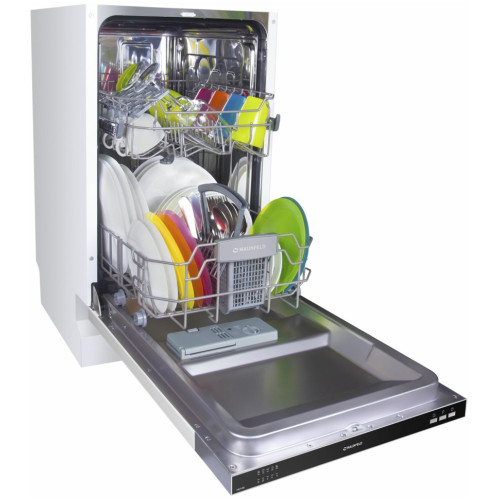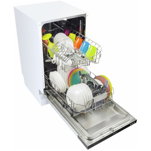 Узкая встраиваемая посудомоечная машина шириной 45 см на 9 комплектов посуды. Высокая эффективность использования внутреннего пространства благодаря специальным корзинам. Внутренняя поверхность выполнена из нержавеющей стали толщиной 0.6-0.8 мм, что обеспечит долгий срок службы при активном использовании. Управление осуществляется с помощью кнопок. Можно выбрать время для отложенного старта (на 3/6/9 часов) и программу мойки: интенсивную (50-70°С, 165 мин), экономичную (45-62°С, 205 мин), 90 минут (65°С, 90 мин), быструю (45-55°С, 30 мин), стандартную. Индикаторы позволяют контролировать наличие соли и ополаскивателя. Звуковой сигнал оповещает о завершении работы. Предусмотрена надежная защита от протечек, самодиагностика неисправностей и сенсор чистой воды. Класс энергоэффективности - А++, класс мойки и сушки - А. Максимальный расход воды на весь цикл мойки всего 9 л.