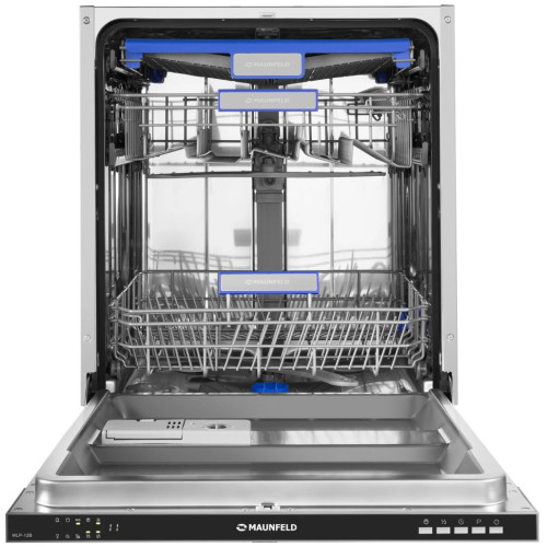 Полноразмерная (ширина 60 см) встраиваемая посудомоечная машина MAUNFELD МLP-12B вмещает до 14 комплектов посуды. Можно мыть также большие кастрюли и сковородки благодаря переставляемой по высоте верхней корзине. Модель характеризуется электронным типом управления с цифровым дисплеем Cold White. Фасад полностью закрыт мебельной панелью. Режим половинной загрузки позволяет снизить расход воды и электроэнергии. Для комфортной эксплуатации предусмотрена система цифровой индикации режимов. Защита от протечек AQUA-STOP гарантирует безопасную работу прибора.