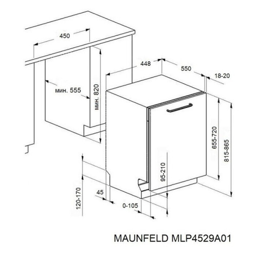 MAUNFELD MLP4529A01 Light Beam— это узкая модель, шириной 45 см (вместо классических 60 см), но весьма вместительная. За раз она может вымыть сразу много посуды, до 9 комплектов — это оценят в больших семьях, а также те, кто любит готовить, часто принимает гостей. MLP4529A01 Light Beam избавит вас от необходимости мыть посуду вручную. В машине максимально эффективно организовано внутреннее пространство. Есть удобная корзина для столовых приборов и мелкой утвари. Верхняя корзина — с изменяемой высотой установки, чтобы можно было мыть посуду разного размера и объёмов. В верхней корзине есть складные держатели для бокалов — дополнительное важное удобство. Предусмотрены несколько программ мытья для посуды разной степени загрязнения. В режиме «Интенсивная мойка» обеспечена обработка посуды очень горячей водой — для максимально качественного результата. Отложенный старт поможет запустить мытьё в удобное время, например, ночью, когда дешевле электроэнергия. Посудомоечная машина MAUNFELD MLP4529A01 Light Beam— помоет посуду без вашего участия, освобождая время для более приятных занятий. Система «Луч на полу» особенно актуальна для встраиваемых моделей, так как во время работы информационный дисплей машины скрыт под столешницей. При использовании этой системы на пол проецируется световой луч синего цвета, показывающий, что устройство работает. Луч гаснет, когда цикл завершен. Меньше шума, меньше беспокойства. Благодаря специальному материалу камеры из нержавеющей стали создается гораздо меньше шума. Она абсорбирует вибрацию, за счет чего работает тихо, всего на уровне 49 дБ, что тише обычного разговора. Экономьте время с быстрой мойкой. Программа быстрой мойки позволяет добиться идеальной чистоты всего за 30 мин., экономя ваше время. Эта программа подойдет для посуды, у которой нет сильных загрязнений, и всего через 30 мин. посуда будет чистой и сухой. Загрузка 9 комплектов посуды. В посудомоечную машину помещается много посуды. Можно накопить её в течение дня или помыть сразу всё после семейного торжества или вечеринки с друзьями. Вместимость — до 9 комплектов посуды.