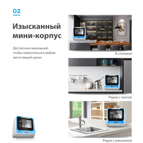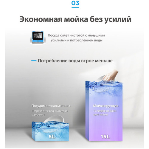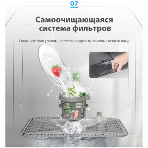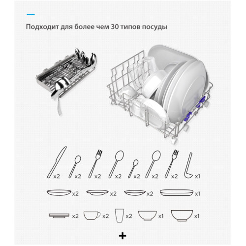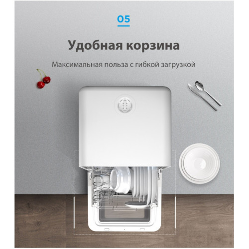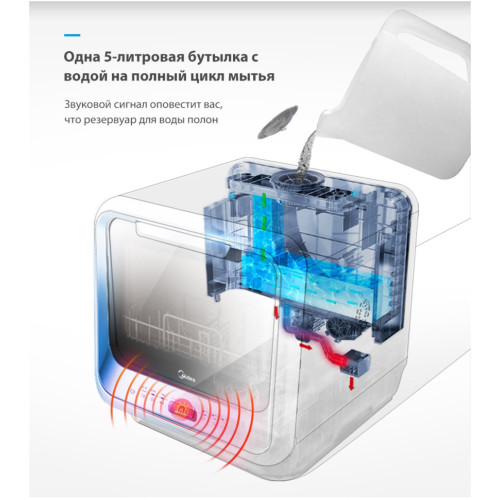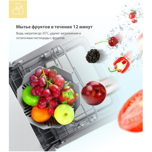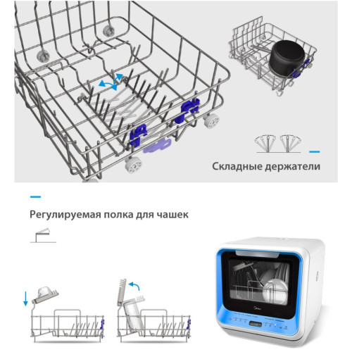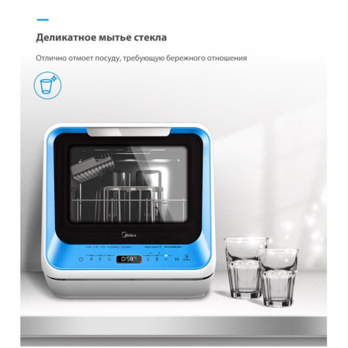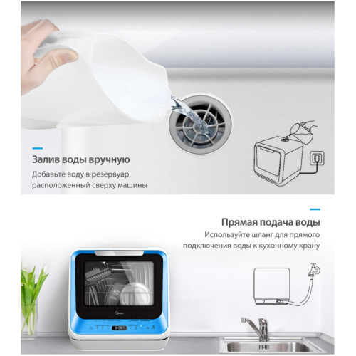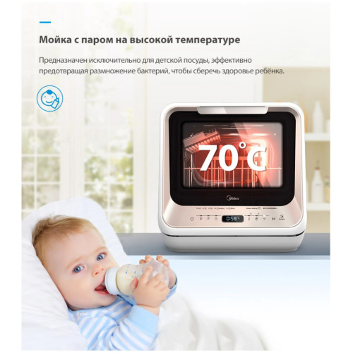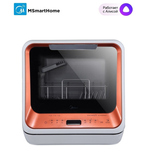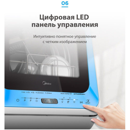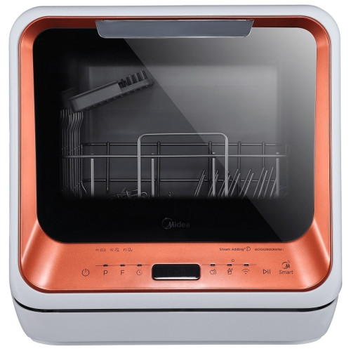 Midea MCFD42900 станет незаменимым помощником на маленькой кухне. Модель не требует подключения к воде, можно просто налить воду в резервуар в верхней части, также ее можно подключить к воде. Максимальный расход воды на цикл (5 литров) сократит расходы в сравнении с мытьем вручную. 6 программ мойки позволит подобрать нужную в зависимости от типа посуды и ее загрязнённости. Отдельная программа мытья с паром подходит для обработки детских бутылочек (темп. 70 С). Преимуществом посудомоечной машины также является наличие специального 12 мин режима для мытья фруктов (без моющего средства, вода 35 С). Отсрочка старта до 24 ч позволит запускать программу в удобное время. Складные держатели, полка для чашек и продуманная конфигурация корзины позволяет мыть одновременно до двух комплектов посуды. Посудомоечной машиной легко управлять, благодаря понятной сенсорной панели с дисплеем. Управление посудомойкой стало еще проще: с помощью Wi-Fi и приложения MSmartHome запускайте мойку удаленно.