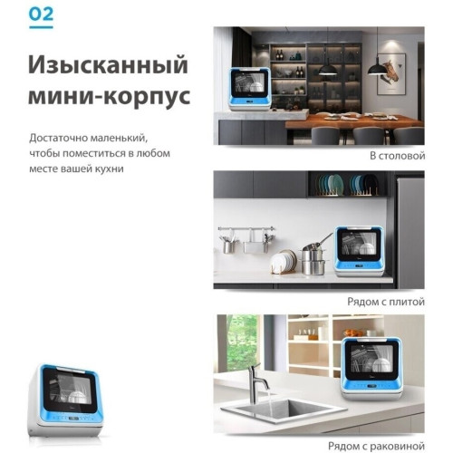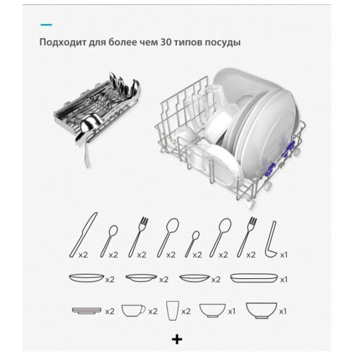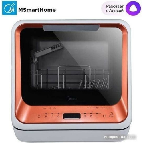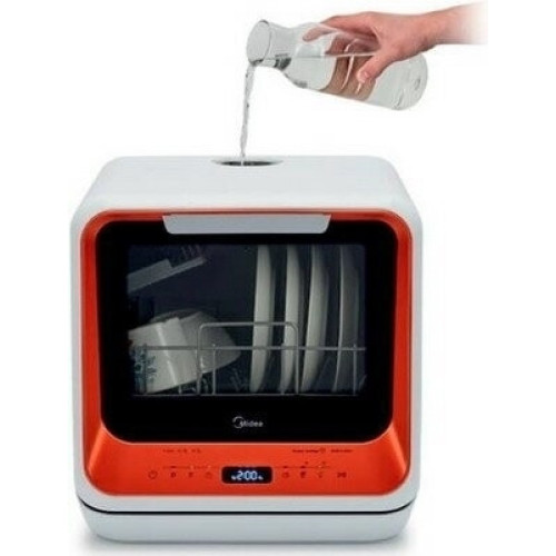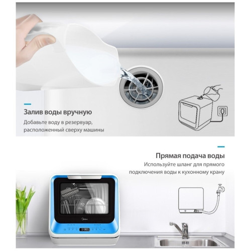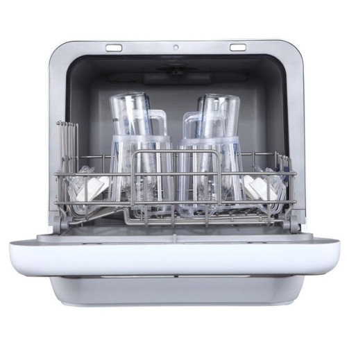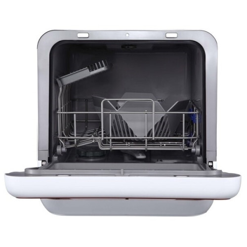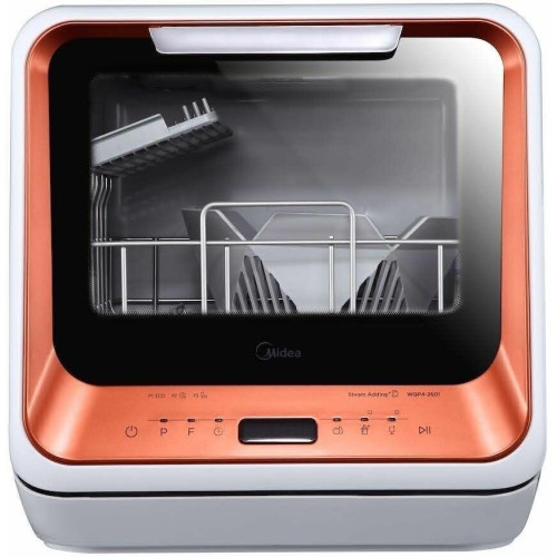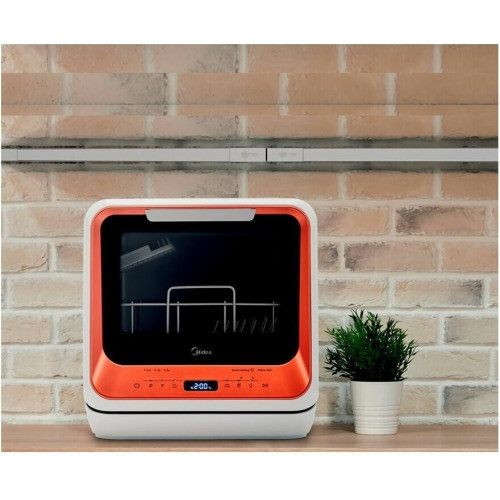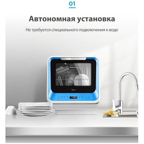 Компактная настольная посудомоечная машина Midea MCFD-42900 Mini шириной 42 см. Благодаря низкому уровню энергопотребления посудомоечной машине присвоен класс энергоэффективности А. Также качеству мойки и сушки присвоен класс А. Уровень шума во время работы не превышает 58 дБ. Вместимость посудомоечной машины позволяет загружать одновременно до 2 комплектов посуды. За стандартный цикл работы расходуется 5 литров воды. Midea MCFD-42900 Mini оснащена электронным блоком управления и цифровым дисплеем. Функционал модели дополнен 6 различными программами мытья посуды и 4 температурными режимами. Среди программ есть интенсивный режим, экспресс-цикл. Также предусмотрена специальная программа для мытья хрупкой посуды, детский режим. Предусмотрена турбосушка посуды. Таймер откладывает начало работы до 24 часов. Система индикации сообщает о наличии ополаскивателя. Моечная камера подсвечивается изнутри.