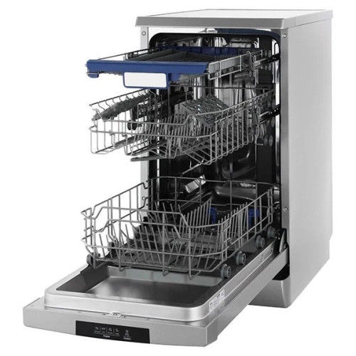 Общие характеристикиТип: узкаяУстановка: отдельно стоящаяВместимость: 10 комплектовКласс энергопотребления: AКласс мойки: AКласс сушки: AТип управления: электронноеЗащита от детей: естьТехнические характеристикиРасход воды: 9 лМаксимальная потребляемая мощность: 2100 ВтЭнергопотребление за цикл: 0.74 кВтчВремя мойки при обычной программе: 205 минУровень шума при работе: 49 дБПрограммы и режимы мойкиКоличество программ: 4Количество температурных режимов: 3Сушка посуды: конденсационнаяСтандартные программы мойки: обычная программа для повседневного мытья, интенсивная программа для сильнозагрязненной посуды, экспресс-программа (быстрый цикл)Специальные программы: экономичная программа для слабозагрязненной посудыРежим половинной загрузки: естьДругие функции и особенностиТаймер отсрочки запуска: есть, от 3 до 9 часовЗащита от протечек: есть, полнаяИспользование средств 3 в 1: естьИндикатор наличия соли / ополаскивателя: есть / естьОсобенности рабочей камеры: внутренняя поверхность из нерж. стали, регулируемая по высоте корзина для посудыДополнительные принадлежности: лоток для столовых приборов, держатель для бокаловЦвет: серебристыйРазмеры (ШхГхВ): 45x61x85 см