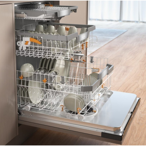 G 7771 SCVi AD 125 Gala Ed Полностью встраиваемая посудомоечная машина с автоматическим дозированием благодаря AutoDos со встроенным PowerDisk. Инновационный дизайн и максимальный комфорт – выдвижной ящик 3D MultiFlex. Самая простая связь с устройством — Miele@home Чрезвычайно низкий уровень шума всего 41 дБ(а) дБ(А) • Тип модели: полновстраиваемая • Вместимость, комплектов посуды: 14 • Тип управления: кнопки, 1-строчный дисплей с белым текстом • Индикатор работы: звуковой • Уровень шума, дБ: 41 • Количество полок, шт: 3 • Технологии: BrilliantLight, ExtraLeise, 1 FlexCare + 4 FlexCare Glass&Bottle, Miele@home, 3D MultiFlex, ComfortClose, PowerDisk, AutoDos, MultiClip • Общая потребляемая мощность, кВт: 2 • Класс энергоэффективности: А • Габариты (В*Ш*Г), мм: 805*598*550 • Габариты ниши (В*Ш*Г), мм: 805-870*600-604*550 • Вес: 48 кг.