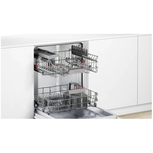 Полноразмерная встраиваемая посудомоечная машина с пятью уровнями распределения воды обеспечивает превосходный результат мытья. Посудомоечная машина оснащена двигателем EcoSilence Drive, который обеспечит эффективную мойку наряду с низким уровнем шума. Ресурс мотора расчитан на 10 лет службы. Посудомоечные машины Bosch с функцией HygienePlus помогут вам обеспечить максимальную гигиену и безопасность. Финальное ополаскивание водой с температурой 70°C гарантирует уничтожение 99,99% бактерий, благодаря чему достигается максимальный уровень гигиены. Направленный вниз луч InfoLight сигнализирует, что программа находится в стадии выполнения. Если открыть дверь посудомоечной машины раньше времени, процесс сушки будет нарушен, так как внутрь камеры попадет холодный воздух. Луч InfoLight автоматически погаснет после завершения программы, таким образом сушка всегда будет выполнена в полном объеме.