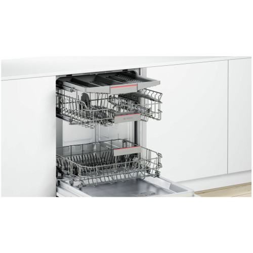 Встраиваемая посудомоечная машина Bosch SMV 46KX05E экономит полезное пространство и смотрится гармонично в любом интерьерном решении. Тихая работа не создает дискомфорт во время беседы или просмотра телевизора. Низкий уровень шума позволяет программировать прибор на включение в ночные часы, когда тарифы на электроэнергию снижаются. Акустический сигнал и индикатор прогресса с проекцией на пол обеспечивают дополнительный комфорт использования.