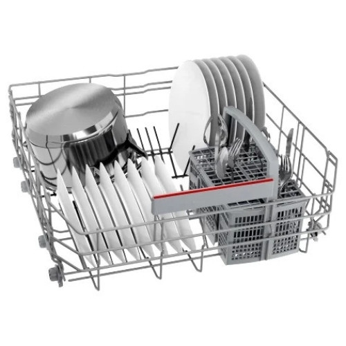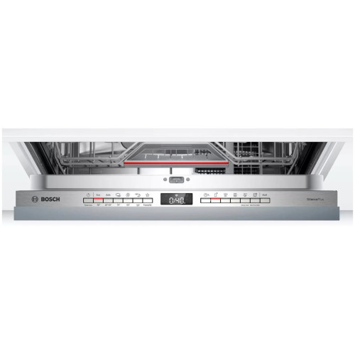 Встраиваемая посудомоечная машина Bosch SMV4IAX1IR – подходящий вариант для большой семьи, ведь она вмещает 13 комплектов. Эта модель оснащена бесщёточным инверторным мотором EcoSilenceDrive, отличающимся экономичным энергопотреблением (класс А), тихой работой и высокой надёжностью. В прибор заложено шесть программ. Автоматическая (45-65°) будет удобна для повседневного использования, «Интенсивная 70°» и «Предварительное ополаскивание» справятся со сложными случаями типа присохших остатков пищи, «Экспресс 65°» – со слабозагрязнённой утварью, а «Эко 50°» сэкономит ресурсы без потери качества мойки. Есть и цикл «Ночной», который не потревожит ваш сон. Устройством можно управлять как традиционно, так и при помощи голосового помощника «Алиса». Технология Home Connect и поддержка Wi-Fi позволит включить машину в систему «Умный дом». Положение верхней корзины настраивается по высоте (три варианта) по системе Rackmatic-3 – это легко сделать даже с полной загрузкой. Колёсики нижнего лотка снабжены стопорами, за счёт которых она надёжно удерживается на направляющих. Фильтр самоочищающийся и не требует частого ухода.