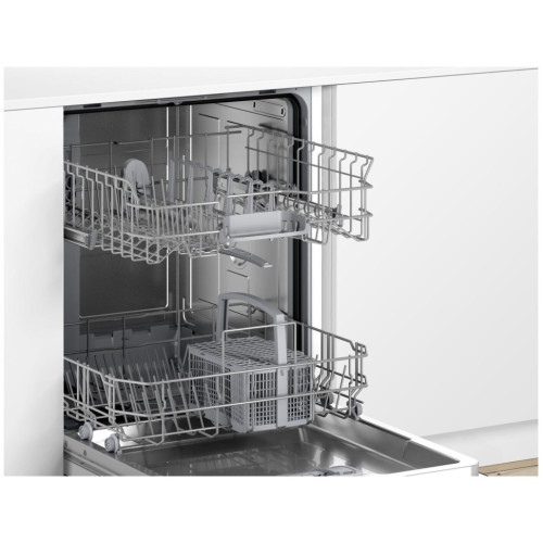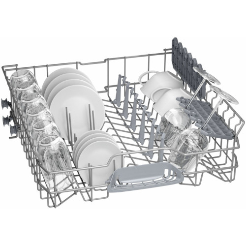 Полноразмерная посудомоечная машина BOSCH SMV25BX04R Serie 2 с инверторным мотором EcoSilence Drive работает тихо и экономично расходует электроэнергию. Машина подойдет для большой семьи — за один раз можно загрузить 12 комплектов посуды. Технология Glass Protection регулируют жесткость воды, поэтому можно не беспокоиться за хрупкие бокалы и фарфор. Гидравлическая система ActiveWater точно рассчитывает направления и оптимальное давление струй воды, чтобы идеально отмыть посуду даже при полной загрузке. Датчик загрузки каждый раз определяет вес посуды и использует только необходимое количество воды. Благодаря контейнеру DosageAssist в ручке верхнего короба все реагенты комбинированного моющего средства растворяются в нужный этап мойки, не оставляя следов. Для разной степени загрязнения посуды в машине BOSCH SMV25BX04R предусмотрены автоматические программы. При необходимости можно включить дополнительное полоскание. Вам не придется ополаскивать посуду перед загрузкой — функция предварительного ополаскивания сделает все за вас. С помощью таймера можно отложить запуск мойки на 3, 6 или 9 часов. Запустите мойку на ночь, чтобы меньше платить за электричество, а режим SilenceProgram уменьшит уровень шума до минимального. В посудомоечной машине SMV25BX04R установлен теплообменник с технологией Hygiene Dry. Во время сушки удается избежать перепадов температур, поэтому можно не переживать даже за тонкое стекло.