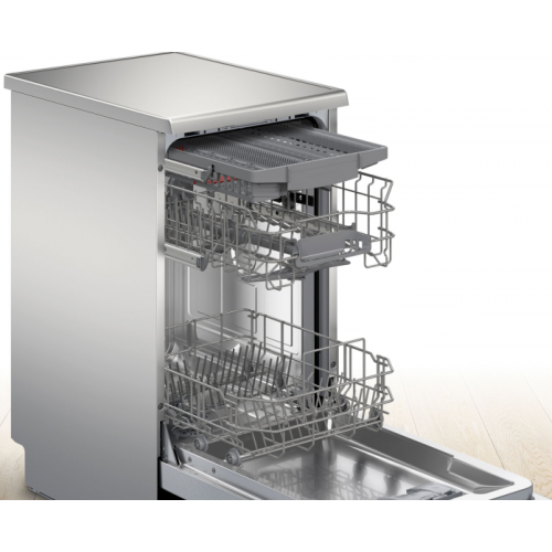 Bosch SPS2HMI54Q Количество комплектов: 10 Управление: электронное Класс мытья: A Класс сушки: A Класс энергопотребления: A Программы: Авто 45-65°C, Эко 50°C, Интенсивная 70°C, Тихая 50°C, 1 час 65°C Дополнительные функции: Половинная загрузка Таймер отсрочки запуска Минимальное время отсрочки запуска (ч): 1 Максимальное время отсрочки запуска (ч): 24 Управление и индикация: LED дисплей Кнопки Home Connect Удаленный доступ позволит вам контролировать посудомоечную с помощью приложения Home Connect в любое время и в любом месте. Wi-Fi Системы безопасности: Защита от протечек AquaStop Блокировка от детей Дополнительная информация: Тип сушки: теплообменник Двигатель: инверторный EcoSilence Drive Съемная столешница Регулируемая по высоте верхняя корзина с системой Rackmatic Сенсор чистой воды Аквасенсор Обнаружение моющего средства Глубина с открытой дверью 90 градусов: 1155 мм Высота съемной столешницы: 30 мм Габариты: 84.5x45x60 см Бренд: Bosch Модель: SPS2HMI54Q