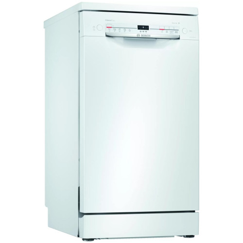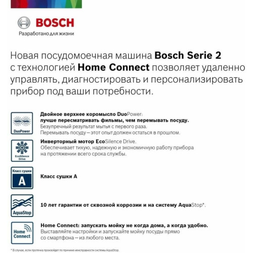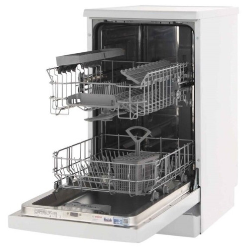 Узкая отдельностоящая посудомоечная машина cбережет драгоценное время и поместится даже на небольшой кухне. Пять уровней распределения воды обеспечат превосходный результат мытья. Особенности: Гарантия качества Bosch: на все посудомоечные машины 10 лет гарантии от сквозной коррозии. Технология Home Connect: дистанционное управление, диагностика и обновление программного обеспечения. Технология DuoPower (двойное верхнее коромысло) обеспечивает безупречный результат мытья с первого раза. Инновационная технология ActiveWater оптимального использования воды для максимальной эффективности мытья посуды Glass Protection- должный уход за нежной посудой IntensiveZone: наилучшие результаты для крупной посуды благодаря повышенному давлению при распылении воды и температуре. Основные сведения: Габариты: 84.5х45х60 см Кол-во комплектов посуды: 9 + 1 сервировочный Управление: электронное Класс мытья: A Класс сушки: A Класс энергопотребления: B Уровень шума: 50 дБ.