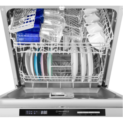 Полноразмерная посудомоечная машина c электронным управлением. Класс энергопотребления А++ — низкий уровень энергопотребления позволит сократить расходы на использование машины Встраиваемая посудомоечная машина для большой семьи, в которую можно загрузить 12 комплектов посуды 6 программ мойки — вы можете выбрать из 6 разнообразных алгоритмов нужную вам программу мойки посуды. Расход воды за цикл 11 литров — низкий расход воды позволит сэкономить на расходах при оплате коммунальных услуг Режим для хрупкой посуды — после мойки с добавлением ополаскивателя бокалы, фужеры и стеклянная посуда сверкают, как новые. Складывающиеся скобы — скобы можно легко сложить, что даст возможность разместить посуду больших размеров Таймер отсрочки старта от 1 до 24 часов — посудомоечная машина включается в установленное время Благодаря функции "3 в 1" компоненты таблетки растворяются постепенно на каждом этапе, очищая любые загрязнения. Можно дополнительно приобрести уникальные аксессуары, которые помогают идеально вымыть бокалы и фрукты. Особенности: Класс энергопотребления А++. Низкий уровень энергопотребления позволит сократить расходы на использование машины. Электронное управление. Электронное управление с дисплеем расположено в торце загрузочной дверцы. Функционал данной модели позволяет вам выбрать программу мойки, включить половинную загрузку, выставить время отсрочки старта (1-24 часов). Вместимость. Благодаря использованию специально разработанных корзин и дополнительного выдвижного лотка для столовых приборов MLP-122D позволяет вымыть 12 комплектов посуды. Экономия воды. Расход воды за цикл 11 литров — низкий расход воды позволит сэкономить на расходах при оплате коммунальных услуг. Широкий функционал. Вы можете выбрать из 6 разнообразных алгоритмов нужную вам программу мойки посуды. Режим хрупкой посуды. После мойки с добавлением ополаскивателя бокалы, фужеры и стеклянная посуда сверкают, как новые. Таймер. Отсрочка старта от 1 до 24 часов — посудомоечная машина включается в установленное время Функция «3 в 1». Благодаря функции «3 в 1» компоненты таблетки растворяются постепенно на каждом этапе, очищая любые загрязнения. Программы мойки: Интенсивная программа - для самой грязной посуды, посуды с присохшей пищей. Стандартная программа - для посуды со средним уровнем загрязнения. Экономичная программа - для посуды с низким и средним уровнями загрязнения. Данный режим обеспечивает оптимальный расход воды и электроэнергии.Программа для стеклянной посуды - для стеклянных бокалов и стеклянной посуды с низким уровнем загрязнения. Программа «90 минут». - для умеренно загрязнённой посуды, для быстрого мытья. Быстрая программа - для посуды с низким уровнем загрязнения, не требующим тщательной сушки, для быстрого мытья. Индикаторы дают возможность контролировать наличие соли и ополаскивателя.