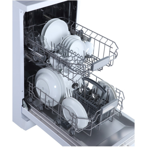Тип посудомоечной машины отдельно стоящаяЗагрузка (комплектов посуды) 9Отсрочка старта 1?24 чТемпературные режимы 5Количество программ 6Программы Интенсивная, Нормальная, ЕСО, 90 минут, Быстрая, Мойка стеклаУправление электронное/кнопочноеКоличество корзин 2Регулируемая по высоте верхняя корзина даПолки для чашек естьВертикальная корзина для столовых приборов естьИндикатор отсутствия соли и ополаскивателя естьИндикатор отсутствия воды естьЗащита от протечек полнаяЗащита от детей естьУровень шума 49 дБПотребление воды 9 лТип сушки конденсационнаяПотребление электроэнергии 0.69 кВт/чКласс мойки АКласс сушки АМощность подключения 2.1 кВтЗагрузка 1/2 даШирина 44.8 смВысота 84.5 смГлубина 60 смЦвет белый