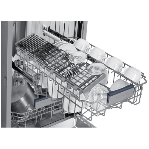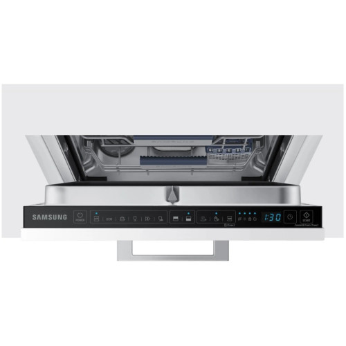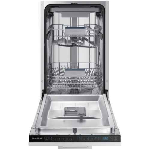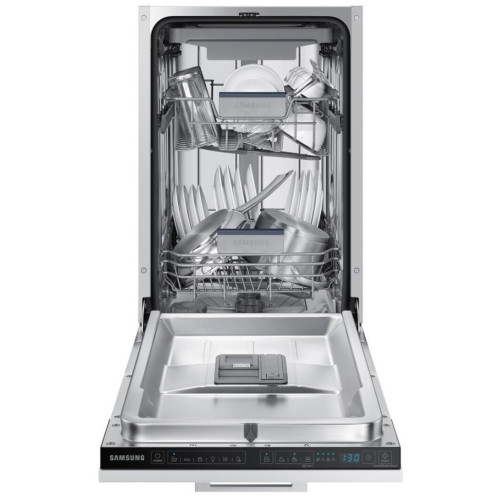 Встраиваемая посудомоечная машина Samsung DW50R4040BB при своих небольших габаритах эффективно и полностью решит проблему с очисткой столовых и кухонных принадлежностей и их просушкой. При этом она сэкономит воду, которая на это расходуется, ведь для одного рабочего цикла модели не понадобится больше 9.5 л. То же самое можно сказать и об электричестве – машина относится к классу энергоэффективности A. Чтобы разместить внутри кастрюли и сковороды нестандартных форм и размеров, высоту корзины для посуды можно регулировать. Опции защиты от протечек и блокировки от детей отвечают за безопасность использования встраиваемой посудомоечной машины Samsung DW50R4040BB. На дисплее отображаются выбранные пользователем настройки, а сенсор чистоты воды поможет быть уверенным в том, что кухонные принадлежности тщательно вымыты. Индикаторы наличия соли и ополаскивателя подскажут, когда будет необходимо пополнить ресурс моющих средств. Метод конденсационной сушки отвечает за то, что посуда будет не только чистой, но и сухой, без разводов и капель воды.