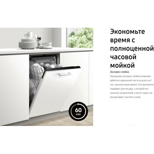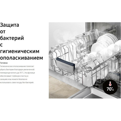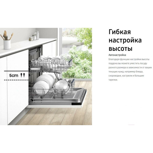 Меньше шума, меньше беспокойства Больше никакого беспокойства с шумной посудомоечной машиной. Благодаря специальному материалу камеры из нержавеющей стали создается гораздо меньше шума. Она абсорбирует вибрацию, за счет чего работает экстремально тихо, всего на уровне 46 дБ, что тише обычного разговора. Экономьте время с полноценной часовой мойкой Программа экспресс мойки позволяет добиться идеальной чистоты всего за 1 час, экономя ваше время. Эта программа подойдет для посуды, у которой нет сильных загрязнений, и всего через час посуда будет чистой и сухой. Помогает обеспечить надежную защиты от протечек Будьте в безопасности от неожиданной протечки с функцией Aqua stop. В случае обнаружения неполадки, подача воды и электричества прекращается, за счет чего можно избежать короткого замыкания и повреждений дома вследствие протечки. Гибкая настройка высоты Благодаря функции настройки высоты поддона вы можете уместить посуду разного размера в зависимости от ваших текущих нужд, например блюда, скороводки, кастрюли и большие тарелки. Защита от бактерий с гигиеническим ополаскиванием Гигиеническое ополаскивание помогает убрать бактерии благодаря увеличенной температуре вплоть до 70?C. Эта функиця обеспечивает глубокую очистку и санацию и вы можете безопасно использовать свою посуду без бактерий.