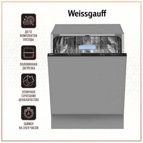 Посудомоечная машина встраиваемая Weissgauff BDW 6025. Встраиваемая посудомоечная машина Weissgauff шириной 60 см воплощает в себе один из наших ключевых принципов: достойное качество по разумной цене! Эта модель оснащена двумя функциональными корзинами и обладает вместимостью 12 комплектов посуды. А 5 эффективных программ всегда помогут подобрать оптимальный режим в зависимости от типа посуды и уровня загрязненности. Отличное сочетание цена/качество делает эту посудомоечную машину идеальной для тех, кто по-настоящему ценит высокое качество без лишних переплат! Мы уже подобрали для вас оптимальное сочетание программ и температурных режимов, чтобы вам осталось лишь нажать на кнопку и насладиться бескомпромиссной эффективностью работы вашей посудомоечной машины! До 12 комплектов посуды одновременно вы можете расположить в данной посудомоечной машине, благодаря современным продуманным и эргономичным корзинам, которыми Weissgauff оснастили эту модель! 5 эффективных программ предлагают пользователю наиболее востребованные режимы: Эко, Интенсивная 65°С, Супер 50 минут, Быстрая 30 минут, Предварительная мойка Турбосушка существенно улучшит качество высушивания посуды по окончании цикла, позволяя значительно сэкономить ваше время после того как программа будет завершена! Половинная загрузка , благодаря которой вы сможете помыть даже самое небольшое количество посуды, не расходуя воду и электричество больше, чем это необходимо. Панель управления, выполненная в современном дизайне с технологичной светодиодной индикацией, станет изящным и эстетичным решением, дополняющим облик вашей кухни. Таймер на 3/6/9 часов , который особенно удобен, если вы ходите начать цикл мытья в ночное время или во время вашего отсутствия. Всего лишь загрузите посуду в камеру, нажмите одну единственную кнопку - и всё остальное машина сделает сама! Индикаторы соли и ополаскивателя , всегда напомнят вам, когда нужно дозаправить посудомоечную машину для её эффективной и бесперебойной работы! Полностью электронное управление, интуитивно понятное даже человеку, никогда ранее не работавшему с подобной техникой, сделает процесс запуска быстрым и лёгким! Настройка уровня звукового сигнала позволит вам установить наиболее комфортный по громкости режим звукового оповещения! Возможность дозагрузки посуды, на начальном этапе мойки будет особенно удобна в случае, если вы забыли поместить в машину забытую на столе кастрюлю или тарелку Класс энергоэффективности A++ - это поистине высокий уровень качества Weissgauff, который позволяет с уверенностью говорить о том, что данная модель обеспечит отличный результат без лишних затрат электроэнергии.