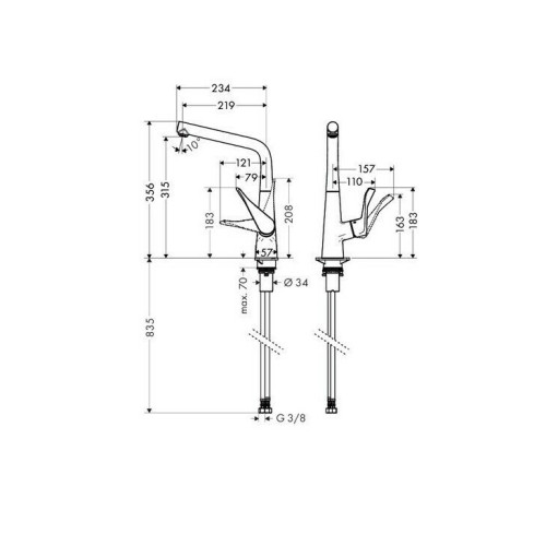 Кухонный смеситель 320, однорычажный * Комплект поставки: однорычажный кухонный смеситель, соединительные шланги, крепежный набор, инструкция по монтажу * ComfortZone 320 * угол поворота излива: регулировка на 3 уровня, на 110°, 150° или 360° * ламинарная струя * расход воды 13 л/мин * керамический узел смешивания * соединительные шланги G ⅜ * подходит для проточных водонагревателей * класс шума: I * класс расхода воды: A