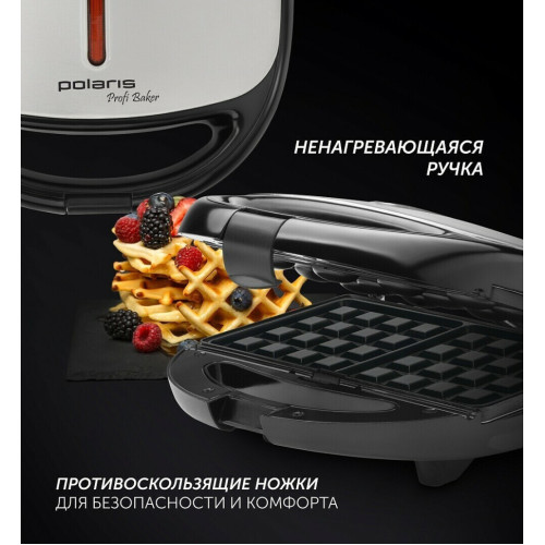 Многофункциональный прибор для выпечки Polaris PST 0203 - 3 в 1. Антипригарное покрытие BIOTORE. Автоматический контроль температуры. 3 пары съемных панелей: * сэндвич, * гриль, * венская вафля. Противоскользящие ножки. 2 индикатора работы. Мощность: 850 Вт.