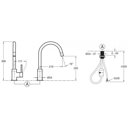 - Излив: длина 216 мм, высота 250 мм