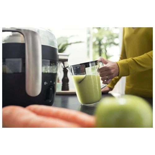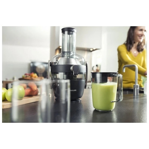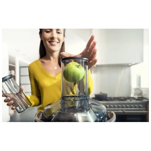 Соковыжималка Philips HR1919/70 поддерживает технологию FiberBoost, позволяющую изменять степень фильтрации жидкости. Благодаря этому с её помощью можно получить как освежающий полупрозрачный напиток, так и более густой сок, содержащий огромное количество витаминов и других полезных веществ. УНИВЕРСАЛЬНОЕ ПРИМЕНЕНИЕ Сочетание мощного мотора и широкой загрузочной трубы позволяет устройству обрабатывать даже яблоки среднего размера и другие подобные фрукты, не разрезая их. ПРОСТАЯ ОЧИСТКА Весь жмых собирается в отдельной камере, не имеющей острых выступов и прямых углов, что помогает избежать накопления его остатков, служащих идеальной питательной средой для бактерий. Для очистки основного резервуара достаточно налить в него воды и включить ненадолго мотор.