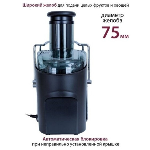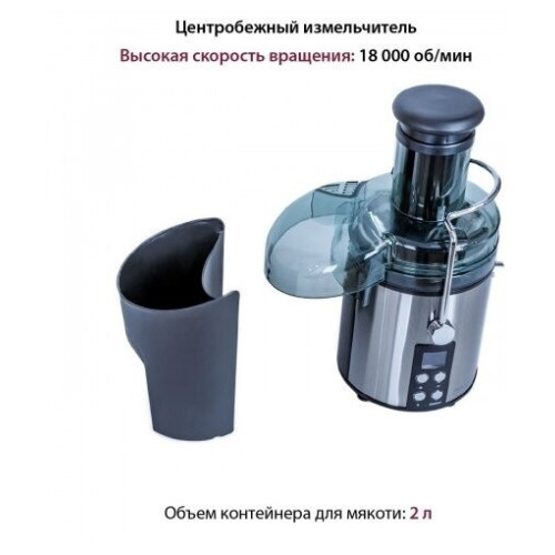 Максимальная мощность, Вт 1000 Количество скоростей: 5 Скорость вращения, об/мин 18000 Импульсный режим работы: есть Диаметр загрузочного отверстия, см 7,5 Резервуар для сока с пеносепаратором: есть Емкость для сока, мл 1100 Емкость для мякоти, мл 2000 Автоматический выброс мякоти: есть Система «капля-стоп»: естm Загрузка фруктов целиком: есть Автоматическая блокировка при неправильно установленной крышке: есть Прорезиненные ножки: есть LED подсветка кнопок: есть Дисплей: ЖК с подсветкой Комплектация: соковыжималка, гарантийный талон, инструкция на русском языке Материал фильтра: нержавеющая сталь Материал корпуса: нержавеющая сталь Цвет: черный с серебристым Электропитание, в Гц 220-240, 50
