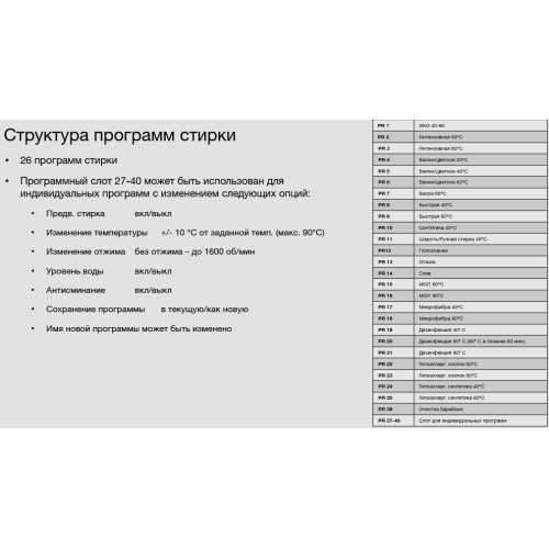 | Список программ | Антиаллергенная/Быстрая/Моя программа/Полоскание/Ручная стирка/Синтетика/Хлопок/Цветные ткани/Шерсть/ЭКО |