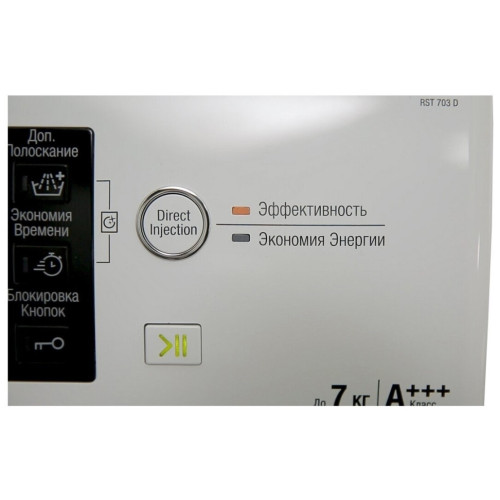 Стиральная машина ''Hotpoint-Ariston RST 703 DW'' создана с применением технологии ''Direct Injection''. Она позволяет подавать в барабан готовый вспененный раствор моющего средства, быстро насыщающий ткань. Благодаря этому значительно повышается эффективность очистки белья и снижаются затраты. Мотор снабжён электронной системой управления ''Digital Motion''. Благодаря этому барабан устройства может не только вращаться, но и совершать движения 10 различных типов. Такая особенность значительно облегчает удаление сложных пятен и предотвращает повреждение белья. Безопасность деликатных тканей подтверждается наличием сертификата ''Woolmark Platinum Care''.