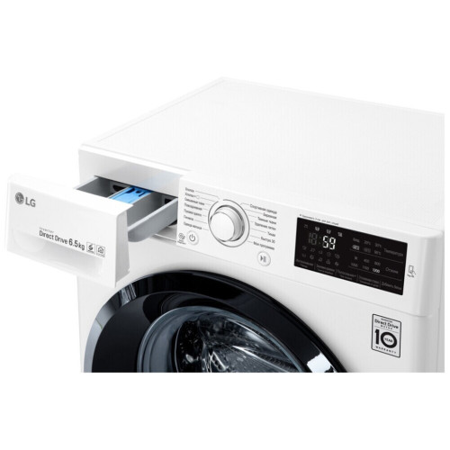 Стиральная машина LG F2J5WN6W с фронтальным типом загрузки представлена в классической белой гамме с люком черного цвета. Она обладает габаритами 60×85 × 45 см и рассчитана на 6,5 кг белья. Электронное управление с сенсорной панелью интуитивно понятно и не вызывает сложностей в использовании. Дисплей на передней панели показывает всю информацию о запущенной программе. Отличная работа Устройство относится к классу стирки А — максимально устраняет пятна и следы грязи с волоком ткани после стандартной стирки. После цикла отжима (уровень В) в белье сохраняется минимум влаги и оно довольно быстро высыхает. При этом скорость кручения барабана можно регулировать от 400 до 1200 об/мин. Модель обладает классом потребления энергии А: она существенно экономит дорогостоящую электроэнергию в процессе работы. Легко подобрать нужное Разнообразие программ (14) позволяет без труда подобрать необходимый режим для деликатных, хлопковых или джинсовых тканей, а также для спортивной одежды, темных вещей и пуховых одеял. Преимущества прямого привода Электродвигатель стиральной машины LG F2J5WN6W присоединяется напрямую к барабану. Благодаря этому в конструкции механизма отсутствуют быстроизнашиваемые детали, такие как щетки и ремень. Это повышает надежность мотора и значительно увеличивает срок эксплуатации агрегата.