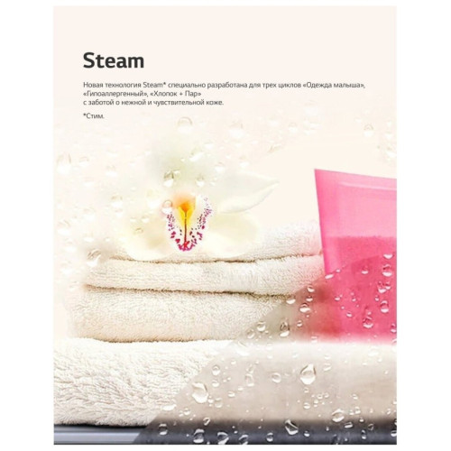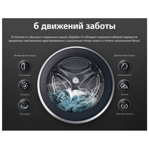 Новая технология Steam* специально разработана для трех циклов Одежда малыша, Гипоаллергенный, Хлопок + Парс заботой о нежной и чувствительной коже. Система прямого привода Мотор крепится напрямую к барабану, таким образом система прямого привода не имеет в своей конструкции легко изнашивающихся деталей, что обеспечивает высокую надежность и долговечность работы мотора. 6 движений заботы В отличие от обычных стиральных машин, барабан LG обладает широким набором вариантов вращения, максимально адаптированных к различным типам ткани и степени загрязнения белья. Минимальный уровень шума Система прямого привода не имеет в своей конструкции щеток и ремня, поэтому в процессе работы создает гораздо меньше шума. Поскольку ось вращения двигателя и барабана совпадает, уровень вибрации снижается до минимума.