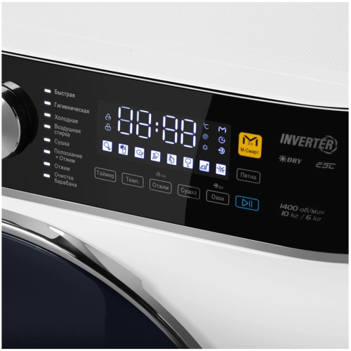 Узкая стиральная машина с потрясающим показателем загрузки белья до 10 кг. Современный инверторный двигатель обеспечивает высокую энергоэффективность и минимальный уровень шума 62 дБ. Автобалансировка загрузки равномерно распределяет белье внутри барабана и гарантирует низкий уровень шума при отжиме даже на самых высоких оборотах. Загрузка до 10 килограммов позволит отстирать всю необходимую одежду за один цикл, сэкономив время и электроэнергию. Сенсорное управление просто и понятно в использовании: выберите программу с помощью поворотной ручки, а нужные параметры с помощью одного прикосновения. Большой выбор программ – 16. Помимо традиционных режимов для стирки хлопка и синтетики есть программы «Детская одежда», «Гипоаллергенная», «Пуховики» и «Воздушная стирка». Различные режимы для более эффективной стирки: «М-смарт», «Пятна», «Озон» Большая дверца диаметром 520 мм очень стильно смотрится. Расход воды за один цикл стирки всего 70 л. Защита от детей — система безопасности, позволяющая заблокировать панель управления, чтобы ребенок не смог включить стиральную машину. Стиральная машина оснащена функцией отсрочки старта, чтобы можно было выставить любое удобное время стирки в пределах 24 часов. Система контроля пенообразования автоматически добавит к циклу еще одно дополнительное полоскание, если уровень пены в барабане превысит максимально допустимый.Функции:Таймер - запуск программы можно отложить от 1 до 24 часов. Сушка - для сушки влажных вещей из хлопчатобумажной ткани. Озон - уничтожается до 99,99% бактерий и удаляются неприятные запахи. По завершении программы озон распадается на обычный кислород. Во время работы программы «Озон» вода в машину не заливается. М-Смарт - эта программа поможет определять вес белья и подобрать оптимальное время и температуру стирки. Пятна - позволит выбрать один из 8 видов загрязнения для оптимальной настройки программы удаления пятен.